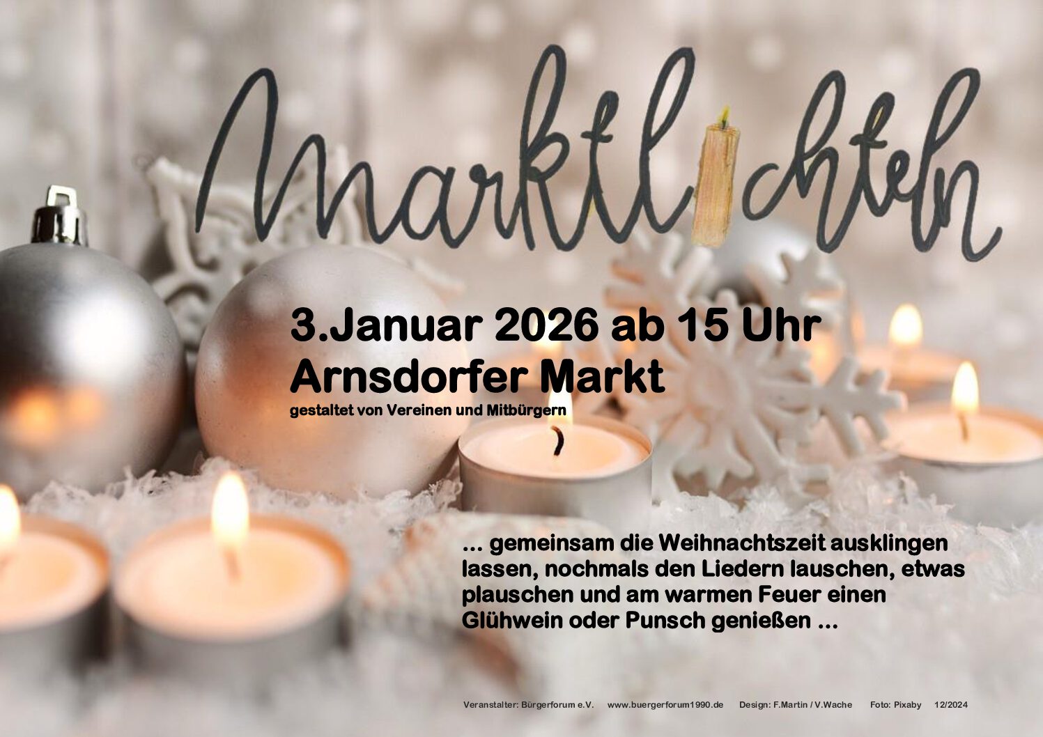 Auch 2026 will das Arnsdorfer Bürgerforum mit dem Marktlichteln die Weihnachtszeit gemütlich ausklingen lassen – wir laden Euch ein, dabei zu sein. Neben Glühwein und Bratwurst möchten wir gemeinsam mit Arnsdorf hilft e.V., dem JuKi e. V. und verschiedenen anderen Aktiven mit kleinen Kulturbeiträgen alle Arnsdorfer zum Schmunzeln und Mitmachen anregen. Am 3. Januar 2026 wollen wir ab 15 Uhr die gemeinsame Zeit auf dem Marktplatz genießen. Das Ende der Veranstaltung ist für 19 Uhr geplant. Wir freuen uns auf Euch!
